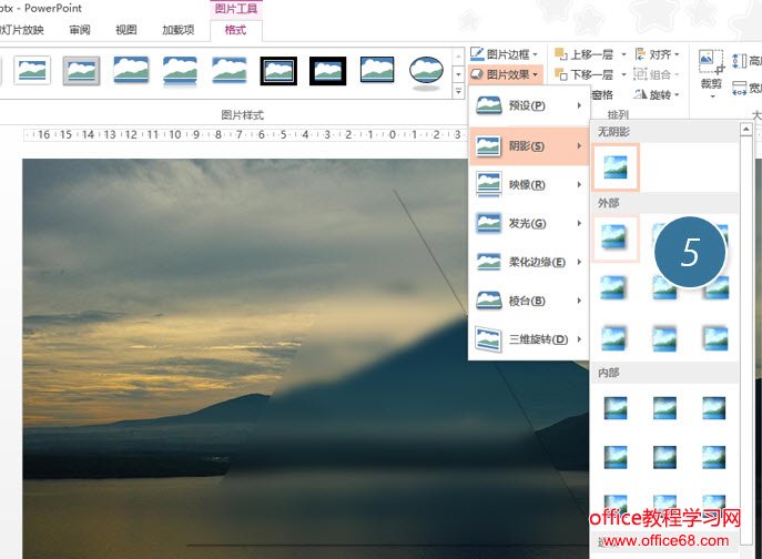 紧接着设置三角形的阴影效果。点击“格式—图片效果—阴影—外部”(下图 5 处)