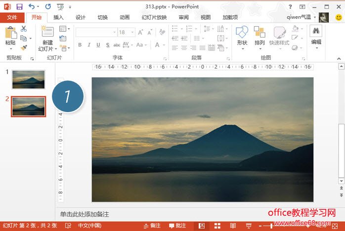 问题:如何利用图片模糊效果制作PPT封面? 解答:了解并掌握PPT的图片模糊功能即可。 具体操作如下: 首先在PPT中插入一张类似样本的风景高清图片,并铺满整个页面,注意这个照片本身是清晰无虚化效果的。接着按Ctrl+D快速复制一份PPT页面。如下图1处。
