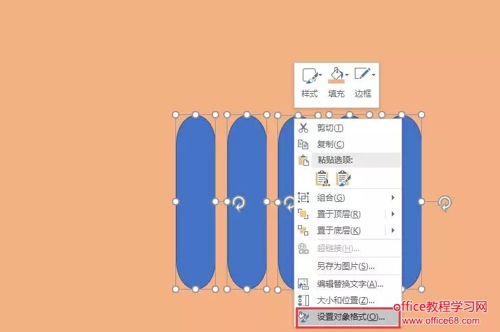 ![]() (4)在最上方插入5个圆角矩形,放置于右下角。在形状上单击鼠标右键,在弹出的快捷菜单中选择“设置形状格式”。