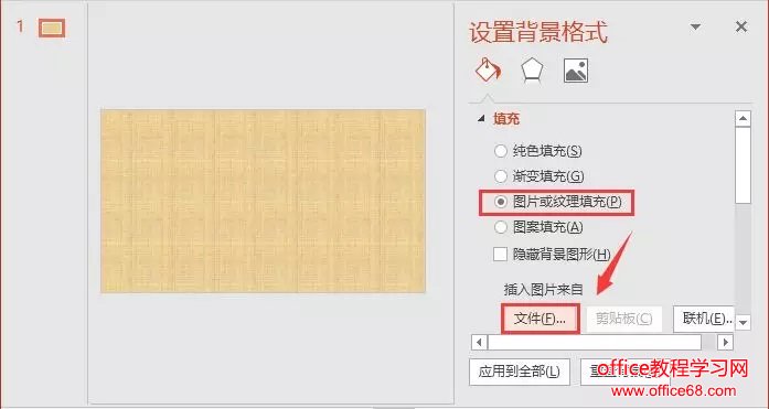 (2)打开 “设置背景格式”任务窗格,在“填充”栏中选中“图片或纹理填充”选项。再点击“文件”按钮。