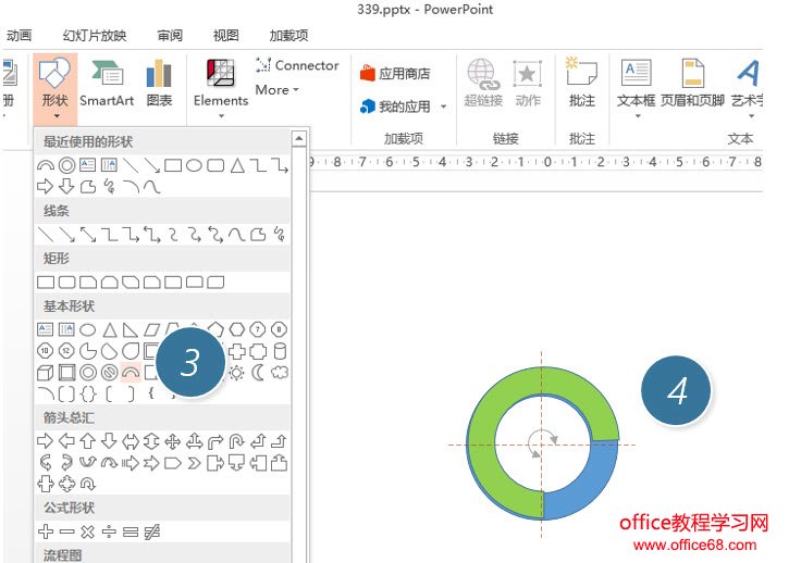 再复制一个同心圆出来,然后在同心圆的基础上插入一个“空心弧”(下图 3 处),将其调整到如下角度(下图 4 处)。注意空心弧的宽度与同心圆的宽度相同。