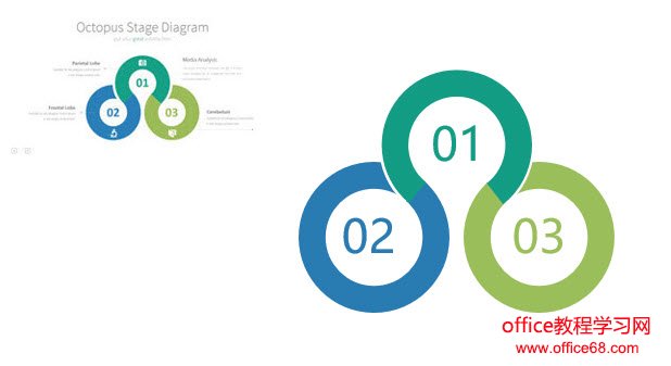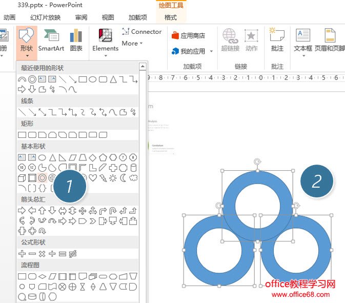 问题:如何PPT设计制作环形Point图? 解答:利用环形图与空心弧的快速组合。 具体操作如下: 首先在新建PPT中,点击“插入-图形-同心圆(下图 1 处)”按住Shift键盘画出一个正环形,并复制三份调整至下图效果。