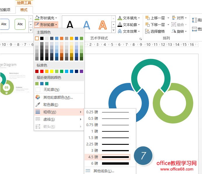 注意观察后会发现,似乎是这个空心弧设置了白色轮廓线?赶紧来设置看看,将其轮廓线设置为白色,粗细为4.5磅左右。(下图 7 处)