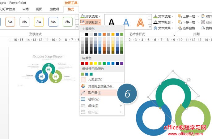 接着去除轮廓线,然后利用取色功能将三个图形分别取成样图的颜色。(下图 6 处)PPT2013版本可以用第三方取色软件来获取图形的RGB码。