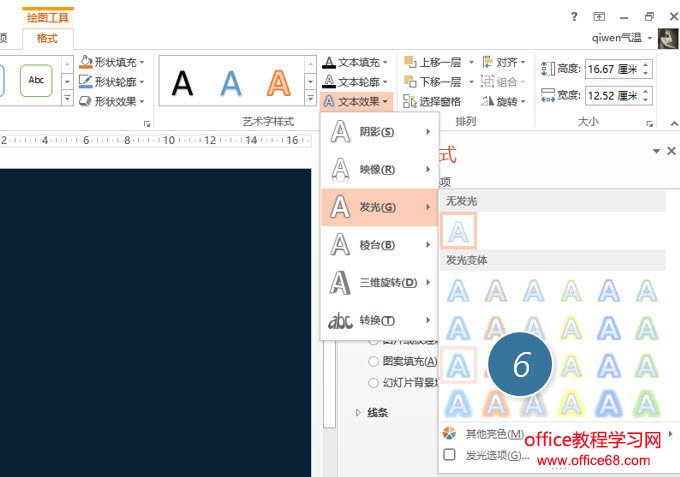 记下来本案例最重要的一步,就是利用PPT的文本效果进行设置,具体操作方法如下: 保持文本框被选中状态,单击“格式—文本效果—发光”,选择第一列第三个发光效果即可。(下图6处)