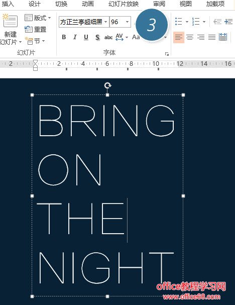 插入一个文本框,设置字体为“方正兰亭超细”字体,这字体系统自带,字体大小96磅。下图3处。这里大家可以自由发挥。霓虹灯一般都比较圆润。