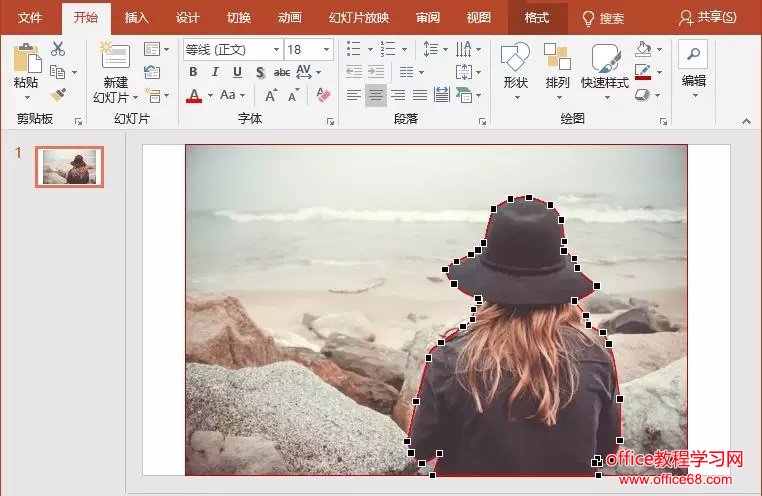 ![]() 然后先选择背景图片,再选择抠取的形状,点击【格式】-【插入形状】-【相交】,即可将人像部分抠取出来,删除背景。