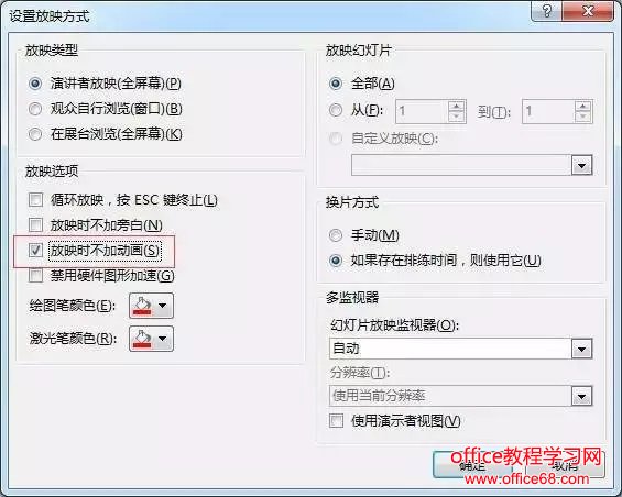 ![]() 在打开的“设置放映方式”对话框中勾选【设置时不加动画】选项,点击“确定”即可。