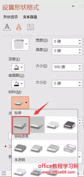 ![]() (3)选择文字,右击选择“设置文字效果格式”命令,打开“设置形状格式”任务窗格。展开“三维格式”栏,设置“深度”颜色为比色块较深的深绿色,“大小”值尽量偏大,如,这里设为500磅。