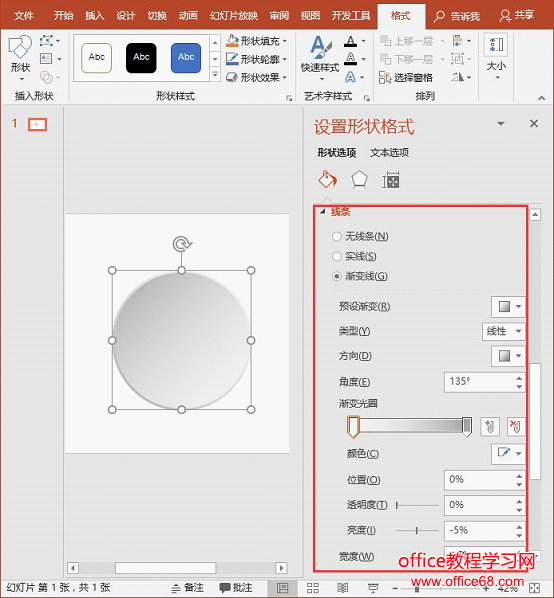 ![]() (3)为轮廓填充渐变色。展开下方的“线条”选项卡,选中“渐变线”单选按钮,然后设置形状渐变填充“类型”为“线性”,“方向”为“线性对角-右下到左上”,“角度”为“90°”,“渐变颜色”为“白色到灰色”,“宽度”为“5磅”,如下图所示。