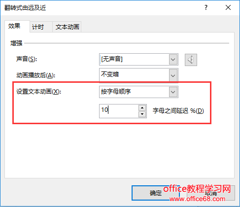 ![]() (3)打开“飞入”对话框,在“增强”栏下设置“动画文本”为“按字母顺序”,并根据自己的喜好调节字母之间的延迟百分比,然后单击“确定”按钮。