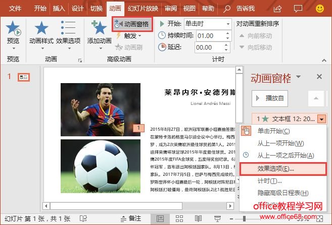 ![]() (2)点击【动画】-【高级动画】-【动画窗格】按钮,打开动画窗格,选中动画窗格中的这个动画选项,点击右侧的下拉按钮,在弹出的菜单中选择“效果选项”命令。
