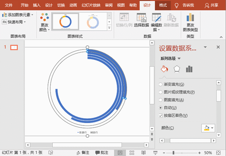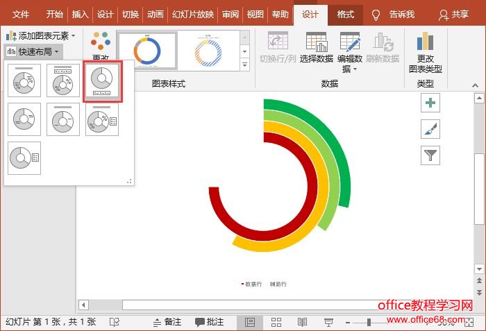 ![]() (6)选择图表,点击【图表工具】-【设计】-【图表布局】-【快速布局】按钮,在弹出的列表中选择”布局3“,加粗圆环图表线条。