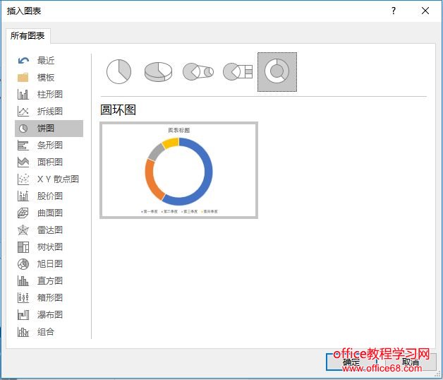 (1)点击【插入】-【插图】-【图表】按钮,打开”插入图表”对话框,选择“饼图”选项卡,选择“圆环图”,单击“确定”按钮插入一个圆环图。
