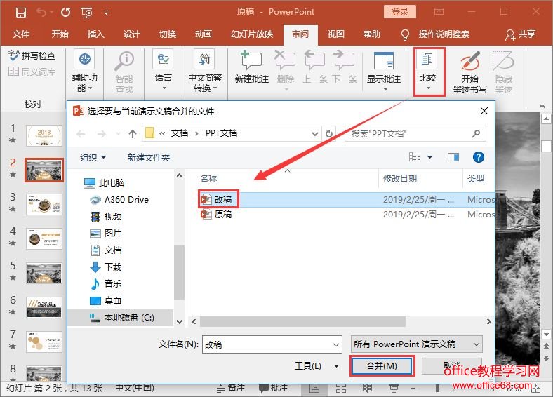 Step 1:在PPT中的比较文档时,我们首先需要打开原文档。然后点击【审阅】-【比较】按钮,在打开的对话框中选择修改后的文档,点击【合并】按钮。