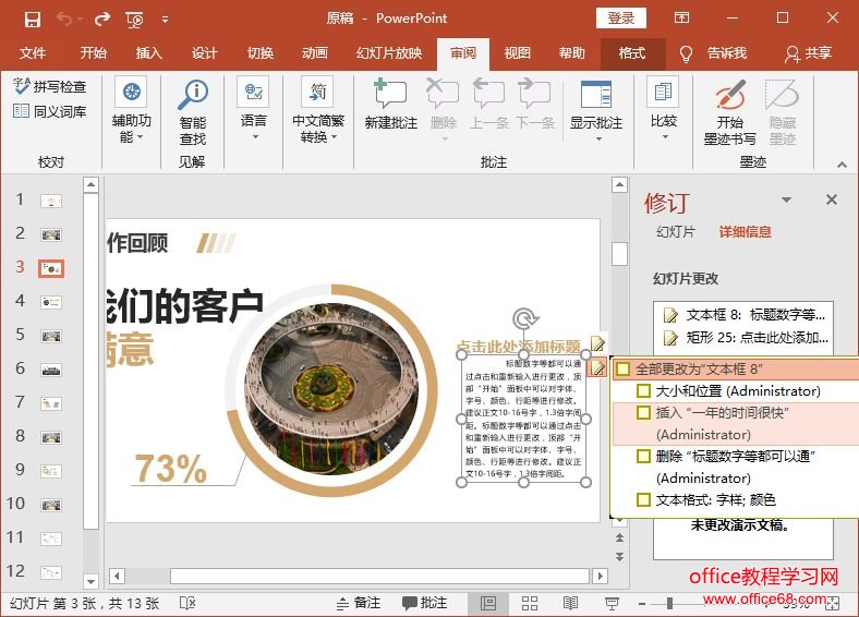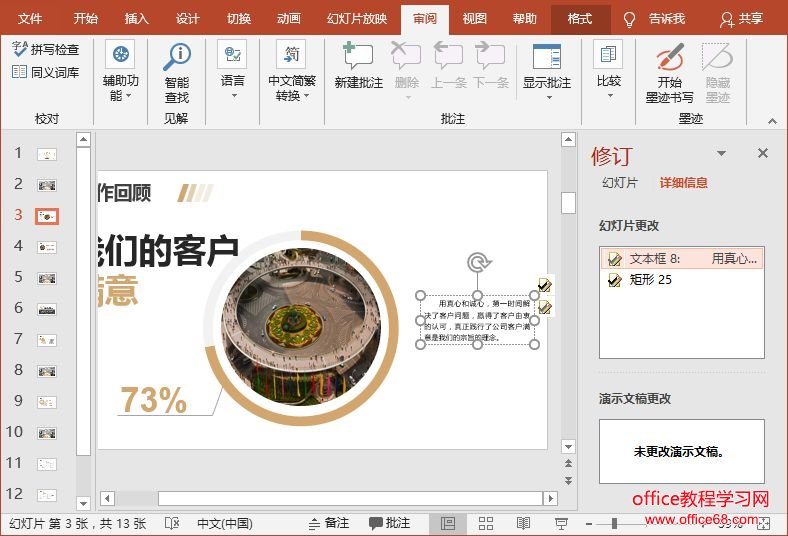 ![]() Step 2:打开修改后的文档,在界面最右侧出现了修订窗口,其中“幻灯片”更改框中显示了所有在当前页面内发生的更改;而“演示文档”更改框中则显示了整个文档中页数上的变化,此时,已进入自动对比模式,可以清晰的查看到修改痕迹,找到不同地方!