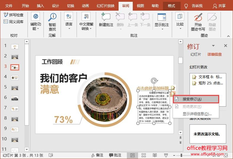 ![]() ![]() ![]() 技巧提示:当然,你也可以点击【审阅】-【接受】按钮,然后选择接受修订或接受对当前演示文稿所做的所有更改命令。或者选择“拒绝更改”命令,拒绝修改的内容。