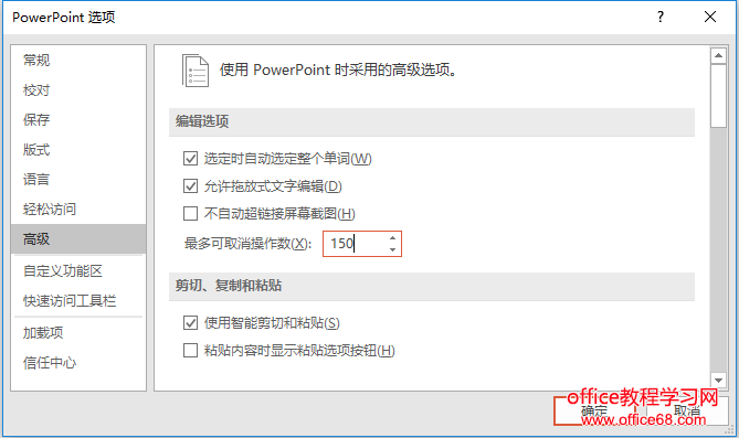 方法:点击【文件】-【选项】-【高级】,在“最多可取消操作数”数值框中输入撤销值即可。
