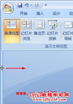 方法二:当我们关闭包含“幻灯片”选项卡的窗格后,实际上是将该窗格隐藏起来了。在程序界面的左侧边缘可以看到隐藏窗格的分隔条。切换到“普通视图”,将光标放到分隔条上,这时鼠标指针会变成带左右箭头的夹子状,按住鼠标左键向右拖动即可。