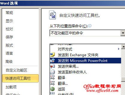 2.在“从下列位置选择命令”下的下拉列表中选择“不在功能区中的命令”,找到“发送到Microsoft PowerPoint”,单击“添加”按钮,然后确定。