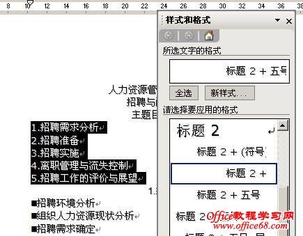 首先需要对Word文档中的内容进行必要的精简,如仅保留各种标题和简明的文字说明,然后进行格式设置。在Word 2003中,单击菜单“格式→样式和格式化”,打开“样式和格式”窗格,选择相应类别的标题分别设置为“标题1”和“标题2”等。