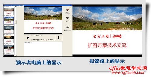 幻灯片分屏演示的效果是,作为演示者,你可看到PPT演示者视图,包括PPT详细的备注,而观众却看不到。上图的左边部分,就是演示者电脑上的显示,右边部分是投影仪上的显示。可以看出分屏演示的好处有:
