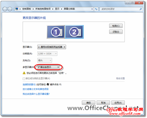 作为一个演讲者,经常会在演示文稿中添加一些备注信息,而在放映演示文稿时,又只想让自己看到这些备注,而观众只能看到演示内容,那么您应该如何做呢? (1)首先,将自己的计算机连接到多个监视器上,并在控制面板中“扩展这些显示”,最后,单击【确定】按钮关闭控制面板,并保留更改。