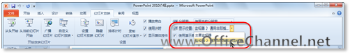 (2)在PowerPoint 2010演示文稿中切换到“幻灯片放映”选项卡,并在“监视器”选项组中选中“使用演示者视图”复选框,在“显示位置”下拉列表框中选择“监视器2”。