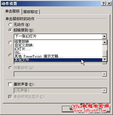 ![]() 在PowerPoint适当的位置插入这个动作按钮后,系统会自动打开“动作设置”对话框,在“单击鼠标”选项卡中的“超链接到”下拉框中选择“其他文件”,如图