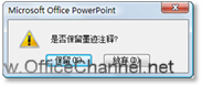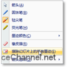 图3 擦除所有墨迹 (4)想要从笔的状态返回箭头指针状态,可以单击快捷工具栏上的【指针选项】按钮,在打开的快捷菜单上执行【箭头】命令。还可以通过按下【Ctrl】+【A】组合键或【Esc】键返回箭头指针状态。 (5)当结束放映时,会弹出如图4所示的“Microsoft Office PowerPoint”询问消息框,询问是否保留墨迹注释,单击【保留】按钮会保留所做的标注。