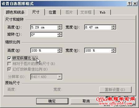 在对象上单击鼠标右键,选择快捷菜单中的“设置自选图形格式”(如果是图片的话,该命令就会变为“设置图片格式”),在弹出的“设置自选图形”对话框中的“尺寸”选项卡中。选中“锁定纵横比”复选框,如图所示,用户也可以在这里使用实际的值或百分比来改变对象的尺寸。