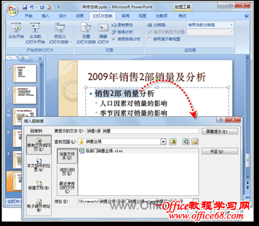 图2 添加超链接 (3)设置完成后单击【确定】按钮,关闭对话框。当在放映过程中单击此超链接时,即可自动打开工作簿并定位到名称所在的单元格区域,如图3所示。