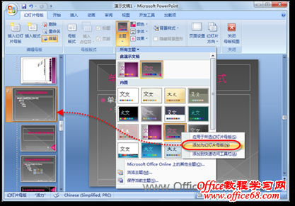 4)再次单击【主题】按钮,在“主题样式库”中,鼠标右键单击所要使用的第2个主题样式,并在随即打开的快捷菜单中,执行【添加为幻灯片母版】命令,即可添加第2个幻灯片母版,并应用该主题样式,如图3所示。