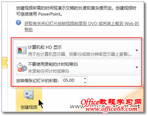 图2 创建视频按钮 3. 通过右侧“创建视频”选项区域中提供的选项,可以调整视频文件的分辨率、是否使用录制的计时和旁白,以及调整放映每张换幻灯片的时长等。设置完成后,单击【创建视频】按钮,如图3所示。