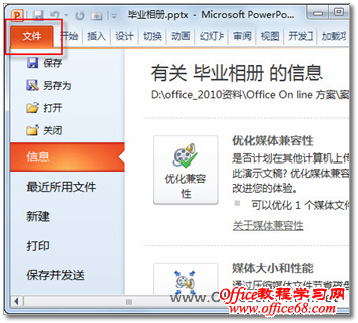 视听效果俱佳的电子相册制作成功后,小刘想将其分享给其他同学,此时,她考虑到对方不一定安装PowerPoint 2010,那样就不方便欣赏该电子相册了,有什么好方法能解决该问题呢?小刘发现了PowerPoint 2010中提供的“创建视频”功能,借助它,可以轻松地将演示文稿制作成视频文件,这样,其他同学就可以通过视频播放器(可以使用Windows自带的Media Player)来欣赏电子相册了。 仅通过“保存并发送”视图中的“创建视频”功能,即可快速地将演示文稿制作成视频文件。 1. 在电子相册中,单击“文件”选项卡打开后台视图时,将自动显示“信息”视图中的信息,如图1所示。