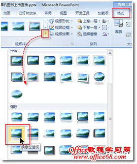 图3 插入的视频 修饰视频 刘经理插入视频后,觉得幻灯片中的视频对象就像一张普通的图片似得,没有特色,因此,他打算为视频穿一件漂亮的“衣服”。 1. 确保选中幻灯片中的视频对象,然后在“视频工具”的“格式”上下文选项卡的“视频样式”选项组中,单击【其他】按钮,在随即打开的“样式库”中选择“映像左透视”效果,如图4所示。