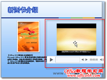 图2 选择视频 3. 视频文件被插入到幻灯片中后,鼠标拖拽,适当调整其大小和位置。在视频对象选中状态下,或将鼠标指向它时,在其下方将会显示一个播放控件,借助它,可以自由控制视频的播放,以预览视频播放效果,如图3所示。