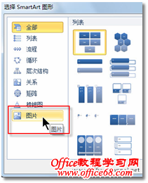 2. 在随即打开的“选择SmartArt图形”对话框中,单击左侧导航窗格中的“图片”选项,如2所示。