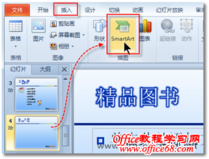 1. 在产品市场宣传演示文稿中,定位到需要展示产品资料的幻灯片中,或者新添加一张这样的幻灯片,然后切换到“插入”选项卡,在“插图”选项组中单击【SmartArt】按钮,如1所示。