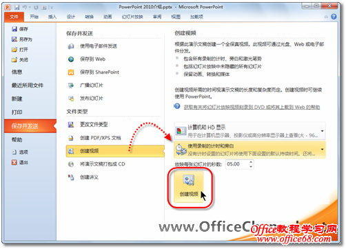 另外,在后台视图的“保存并发送”视图中,执行创建视频的相关命令,同样可以轻松地将当前演示文稿轻松转换成视频文件,并且可自由选择视频文件中是否包含录制的计时和旁白等信息。