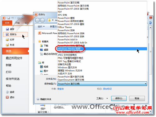 1)在PowerPoint 2010程序窗口左上方,单击【文件】按钮打开后台视图,并单击【另存为】按钮,打开您早已熟悉的“另存为”对话框,在“文件名”文本框中输入文件名,并在“保存类型”下拉列表框中选择“Windows Media 视频”。