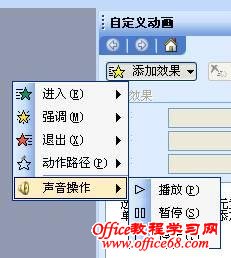 ④先点击页面中的小喇叭,然后在“自定义动画设置窗口”中点的“添加效果”(温馨提示:没有点击小喇叭之前,添加效果按钮是灰色的,不可操作,点击小喇叭之后,添加效果按钮被激活,就可以操作了),在弹出的菜单中点“声音操作”,然后根据需要分别点“播放”“暂停”“停止”,本例中我添加了三个效果,即前面说的播放、暂停、停止。