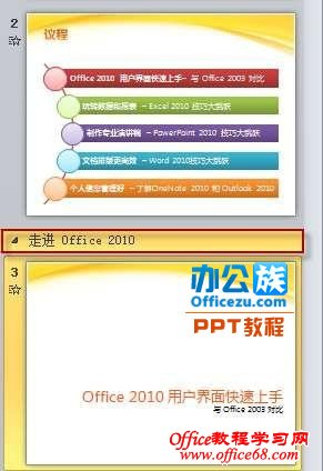 在PowerPoint演示文稿中有时可能会包含大量的幻灯片,此时内容的组织和管理就变得非常棘手了。演示文稿的分节功能,使幻灯片按照内容类别进行逻辑分组,方便管理和导航。 例如:将当前演示文稿的第二张和第三张幻灯片之间添加一个节,并命名为“走进Office2010”。