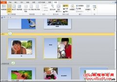 PowerPoint2010 幻灯片中,您可以使用多个节来组织大型幻灯片版面,以简化其管理和导航。此外,通过对幻灯片进行标记并将其分为多个节,您可以与他人协作创建演示文稿。例如,每个同事可以负责准备单独一节的幻灯片。 可以命名和打印整个节,也可将效果应用于整个节。 在幻灯片浏览视图中显示的节...