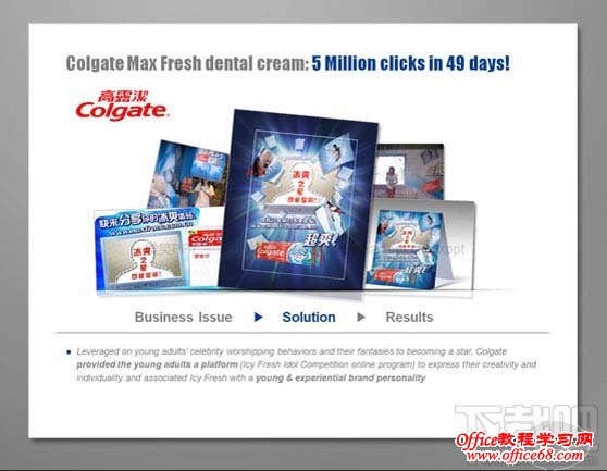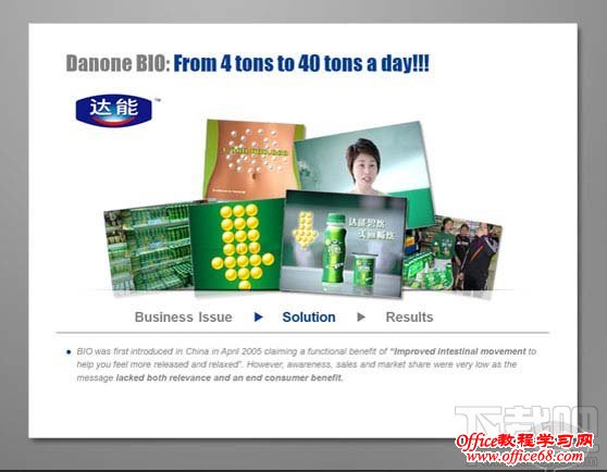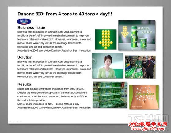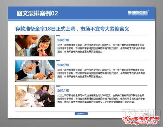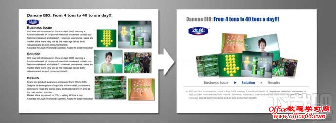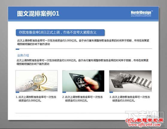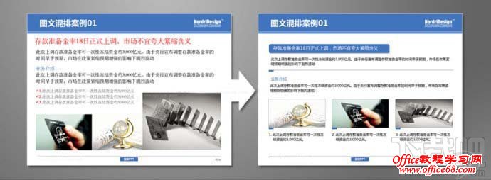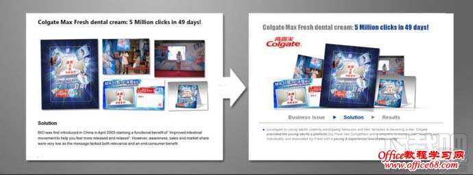 首先将PPT中文本内容区分主次关系,将图片大小调至大小均等,相对应的内容信息则排列至图片下方,使得图片与文字得以相呼应,强调关系性。 案例2:优化前的PPT(before)