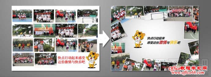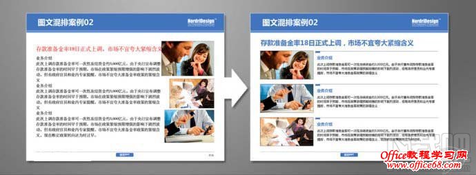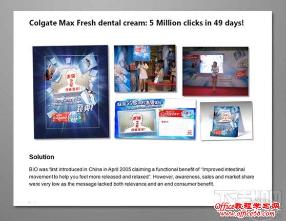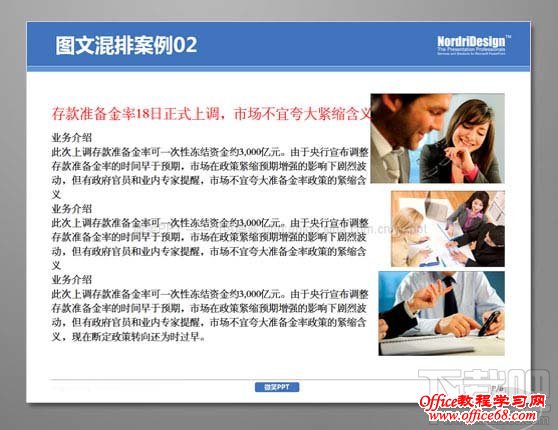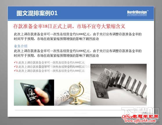 整体步骤如同案例1,加入了线条来区分页面右侧的文本区域,我们强调点、线、面的有序结合,如果以图片(面)文字(点)过于规矩的排列于页面中,不如加入点线条来更好的协调画面 图文无序混排: 总会遇到一些内容轻松、类型活泼的ppt,或是在一些需要创意执行的作业中,我们不希望循规蹈矩的将图片有序的排列在一起。 下面分享的则是“有违常规”的图片摆放效果 案例1:优化前的PPT(before) 左文右图的常规版式。