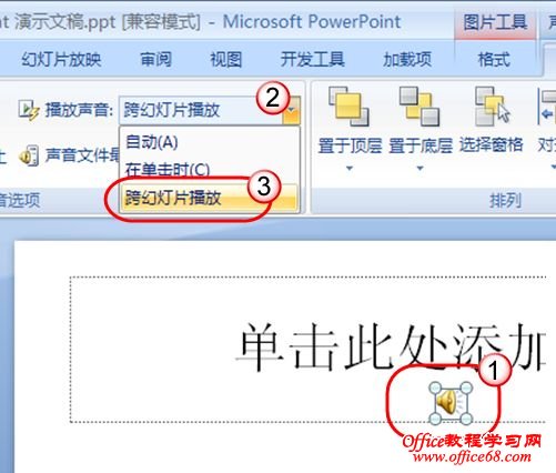 在PowerPoint 2007或者2010中也有这功能,但操作方法与前述本本有所不同。插入音乐之后,鼠标单击小喇叭图标,在顶部选择“声音选项”选项卡,然后在“播放声音”的下拉菜单中就可以选择“跨幻灯片播放”这一项,只是不能控制播放到第几页了。(图4)