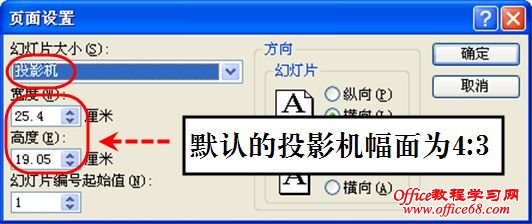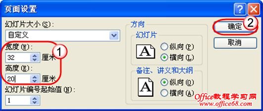 现在,我们把宽度改为32厘米,高度改为20厘米(适用于16:10的宽屏,如果你的投影仪的长宽比例是16:9,则将高度改为18厘米即可)。其它选项保持默认不变,按“确定”按钮退出(如图2),所编辑的演示文档就是宽屏的了。