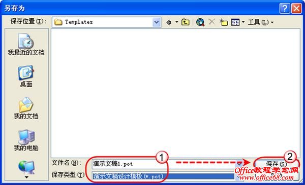如果想一劳永逸,可以将设置好的文件保存为“演示文稿设计模板(*.POT)”(图3)。这样,当再次使用PPT时,调用此模版的页面就是适合于宽屏的比例了。