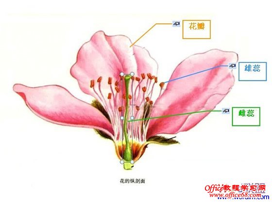 例如点击出现雌蕊,先添加文字标注,然后为这个对象添加自定义动画(示范中选择插除效果并且是从左往右),然后为画面中的雌蕊部分添加一个对象,并设置为触发器。为了让这个对象和画面融为一体,继续设置其为无填充色无透明色。如图所示。